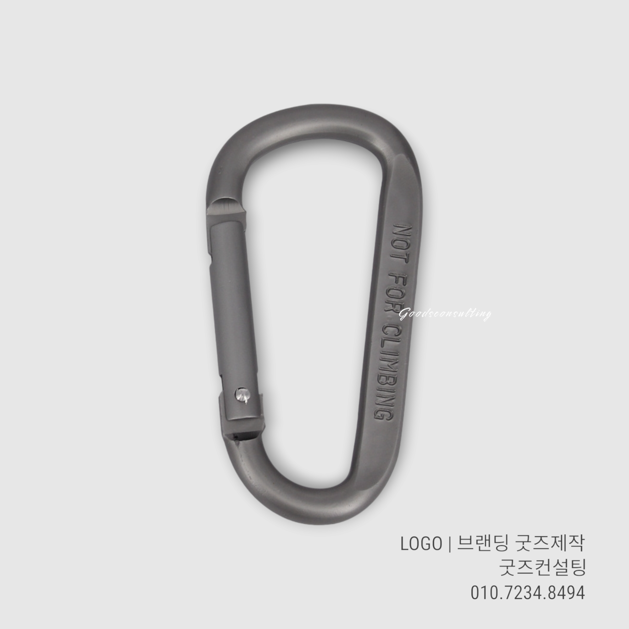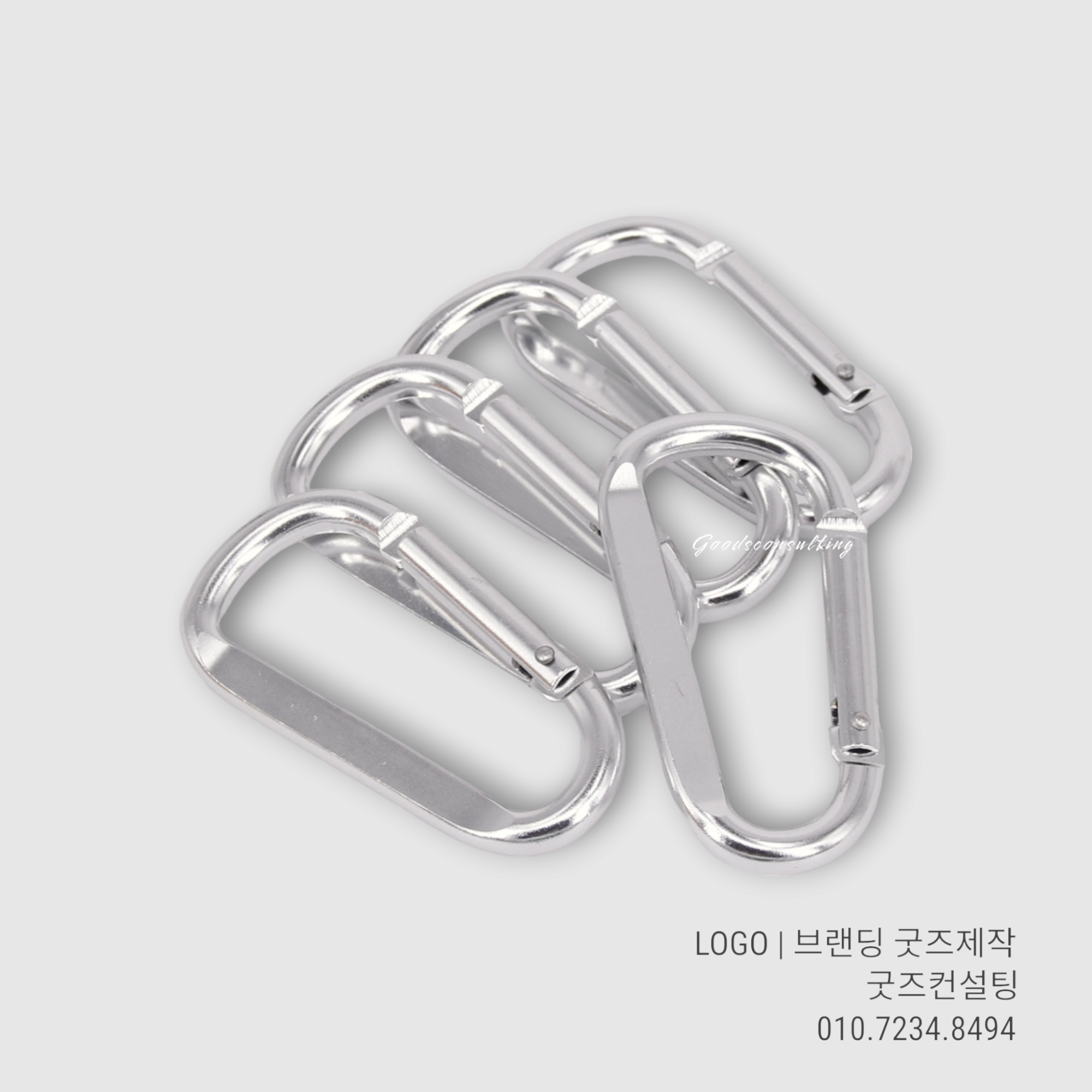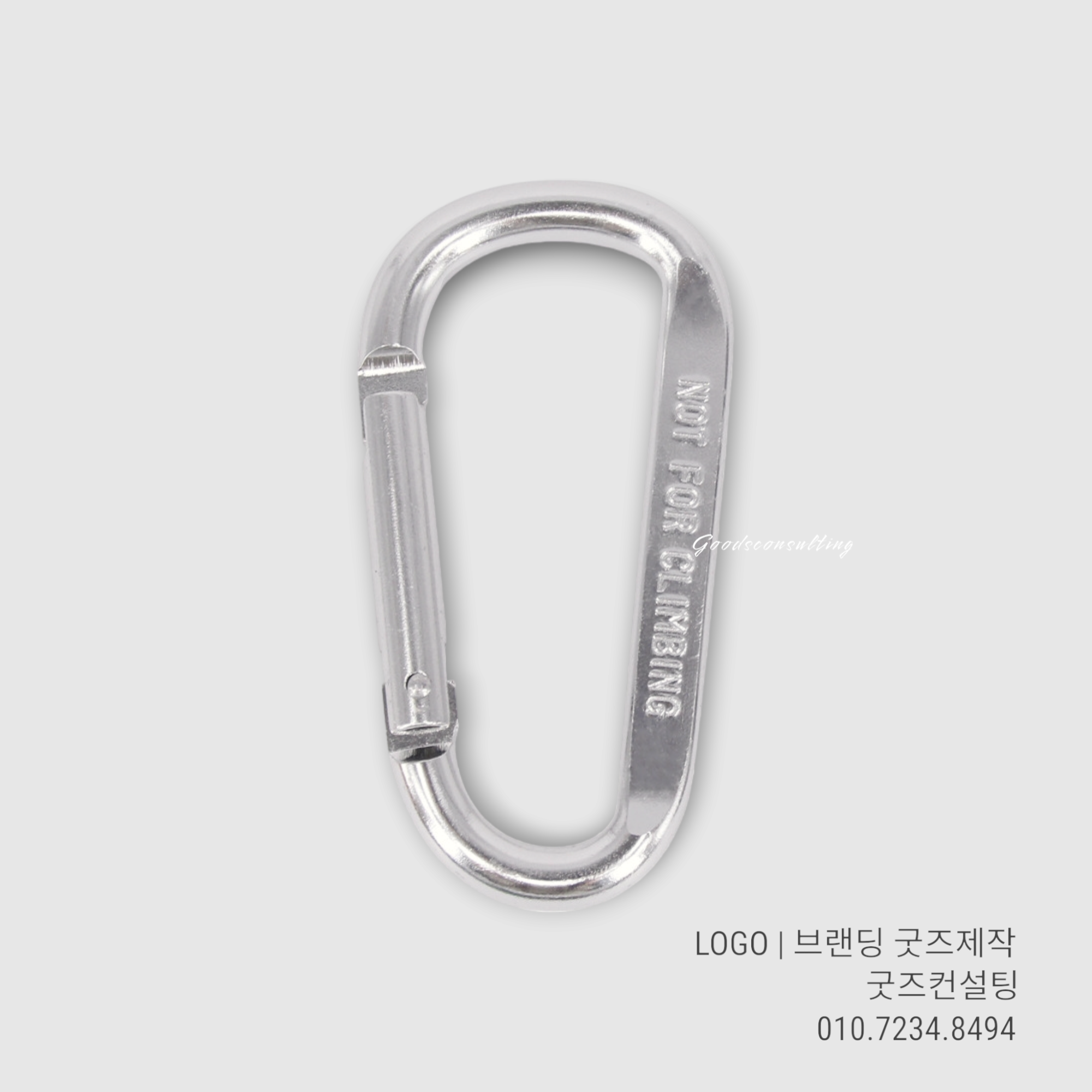 특히 굿즈컨설팅에서 제작되는 카라비너 8호는 알루미늄 소재로 가볍고 튼튼하며, 표면에 정밀하게 로고가 각인돼요.